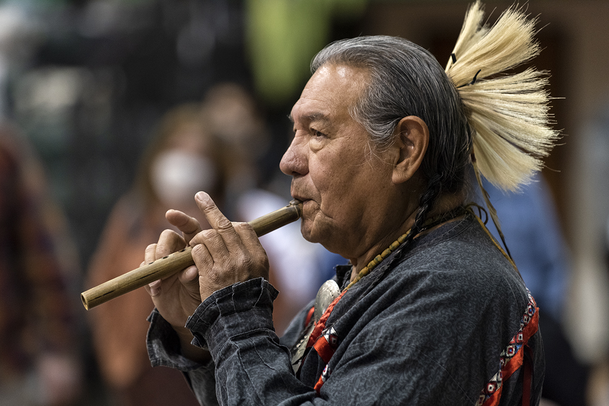 A man plays a traditional flute during the grand entry at WashU’s 31st annual Pow Wow April 16 in the Field House. The Pow Wow was sponsored by the Kathryn M. Buder Center for American Indian Studies at the Brown School. (Photo: Sid Hastings/Washington University)