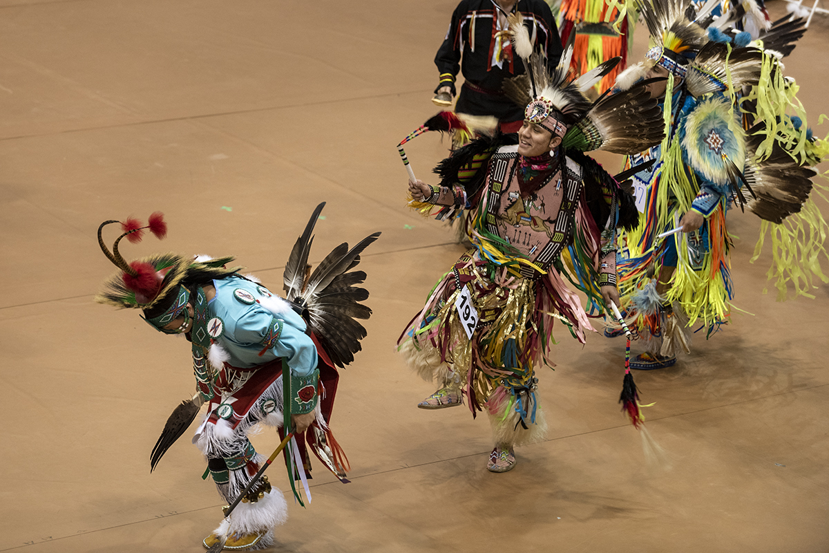 Native dancers compete during the 31st annual Pow Wow April 16 in the Field House. The Pow Wow was sponsored by the Kathryn M. Buder Center for American Indian Studies at the Brown School. (Photo: Sid Hastings/Washington University)