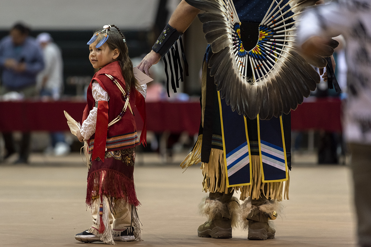 Children and adults alike dressed in traditional attire for the 31st annual Pow Wow April 16 in the Field House. (Photo: Sid Hastings/Washington University)