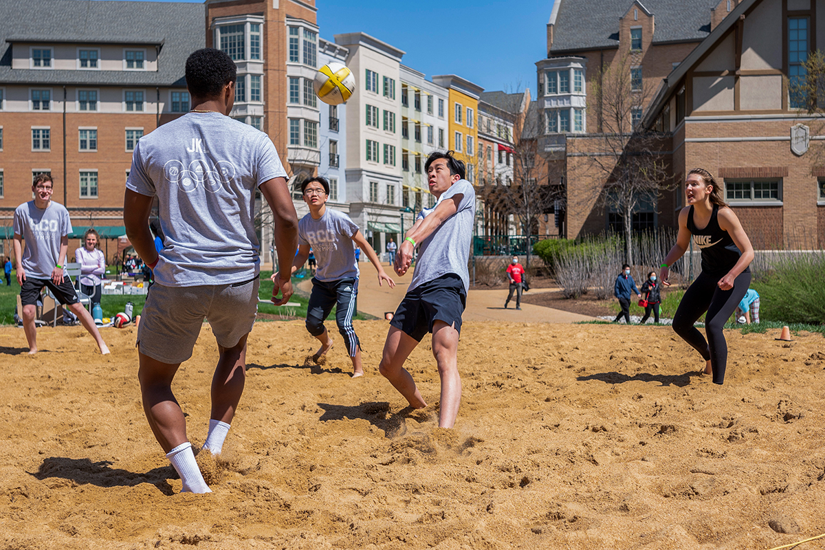 Students play a game of sand volleyball during the WashU Res College Olympics April 16 on the South 40. (Photo: Danny Reise/Washington University)