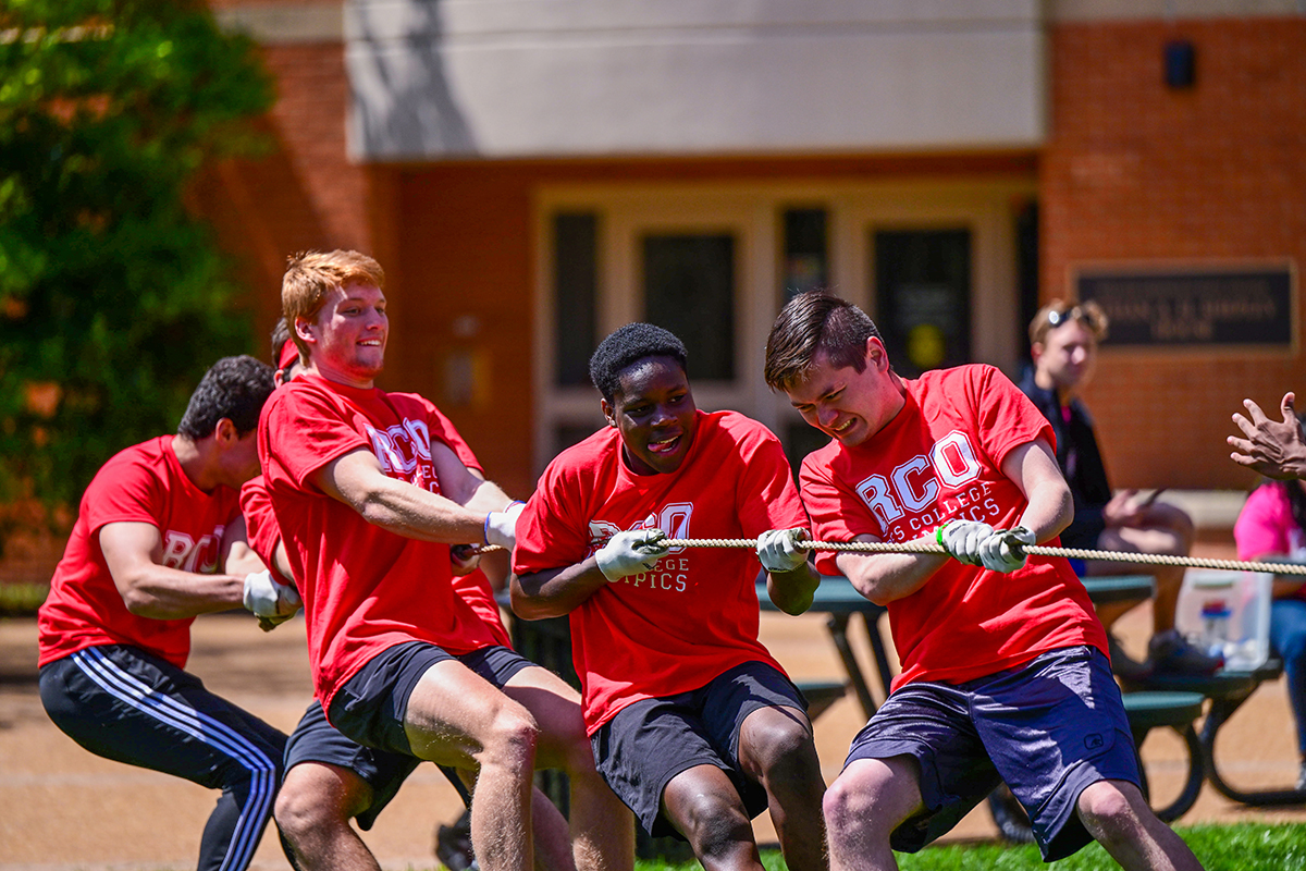 Students participated in games including tug-of-war at the WashU Res College Olympics April 16 on the South 40. (Photo: Danny Reise/Washington University)