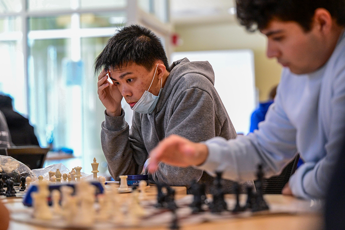 The Res College Olympics also included intellectual games. A student concentrates on his next move during a chess match April 16 at Ursa’s Fireside on the South 40. (Photo: Danny Reise/Washington University)