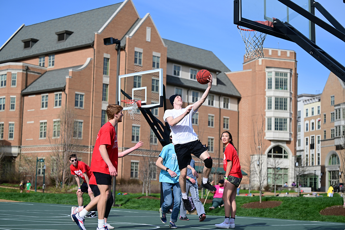 A student jumps in the air during a basketball game on the South 40. Basketball was just one of the many games students participated in at the Res College Olympics April 16. (Photo: Danny Reise/Washington University)