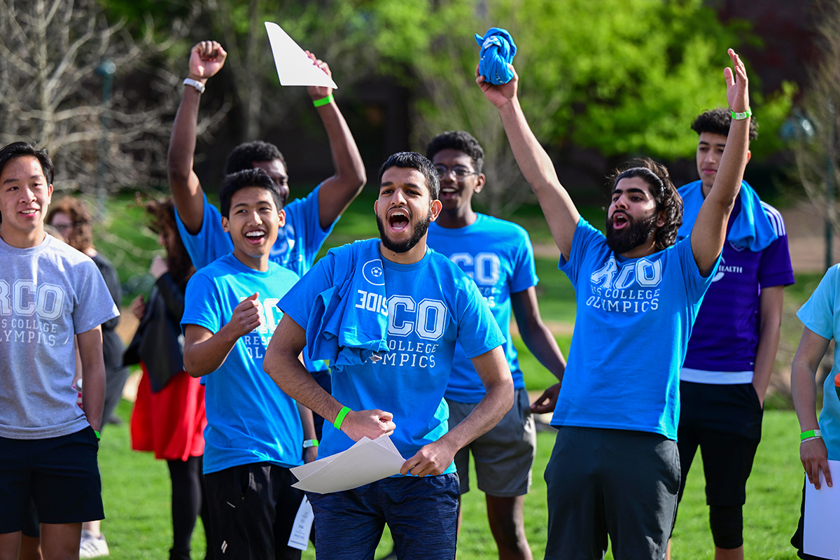 Students on the blue team at the Res College Olympics cheer April 16 on the South 40. (Photo: Danny Reise/Washington University)