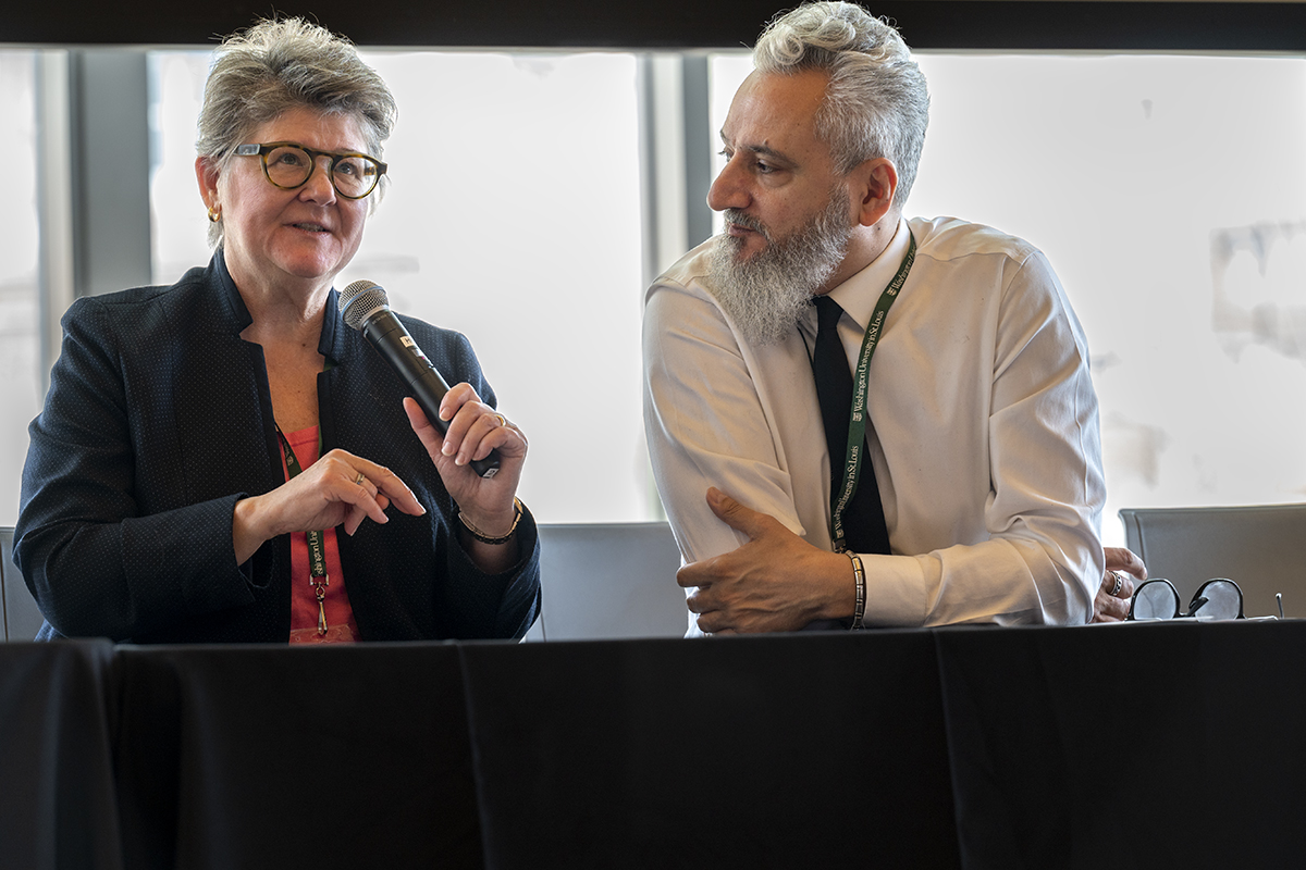 Tonya Edmond and Rodrigo Reis, interim co-deans of the Brown School, present during the inaugural “Hire WashU” event April 7 at Hillman Hall. (Photo: Sid Hastings/Washington University)