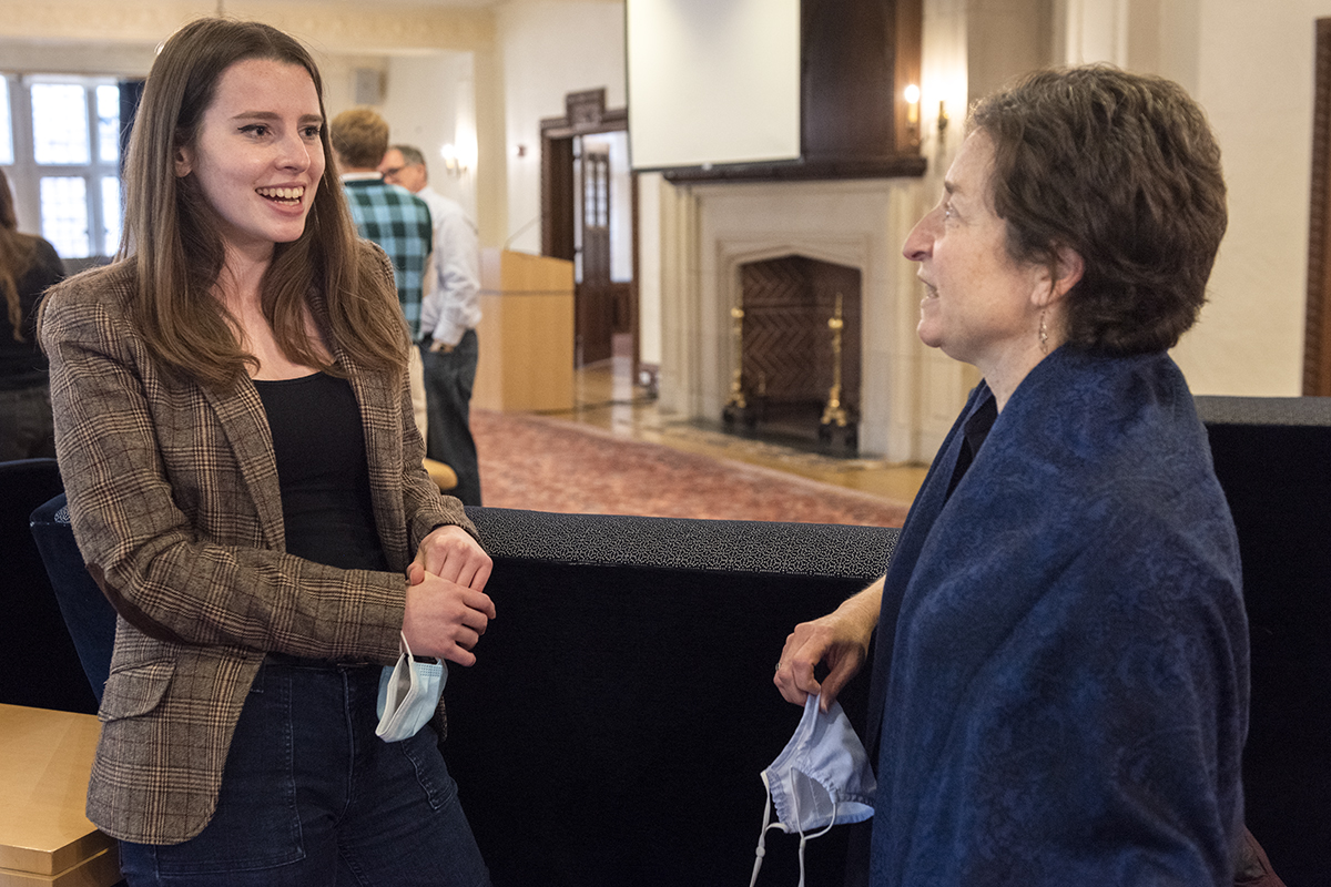 Corinna Treitel (right), chair and professor of history in Arts & Sciences, speaks with another event participant at the Department of History’s “We’re Making History” celebration May 4 in the Women’s Building. (Photo: Sid Hastings/Washington University)