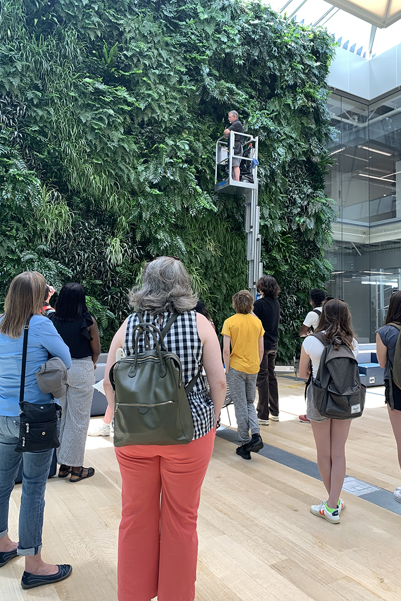Cassie Hage, assistant director of the Office of Sustainability, took staff members on a tour of locations across the Danforth Campus on June 3 showcasing WashU’s efforts to transform its historic campus into a truly sustainable campus. One of the tour highlights was Weil Hall’s green plant wall. Almost 30 feet by 30 feet, the wall is made up of about 5,400 total plants with 10 different species and 280 “Biotiles,” or plugs of plant, installed in the wall. (Courtesy photo)