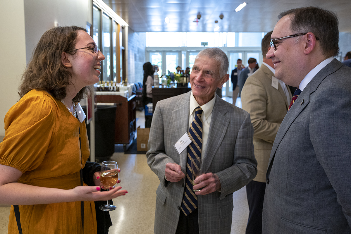 Mia Kweskin, Bob Virgil and Chancellor Andrew D. Martin talk during a partnership celebration event on May 31 where alumni from across the university’s colleges currently employed by Edward Jones met for a reception at Frick Forum. (Photo: Sid Hastings/Washington University)