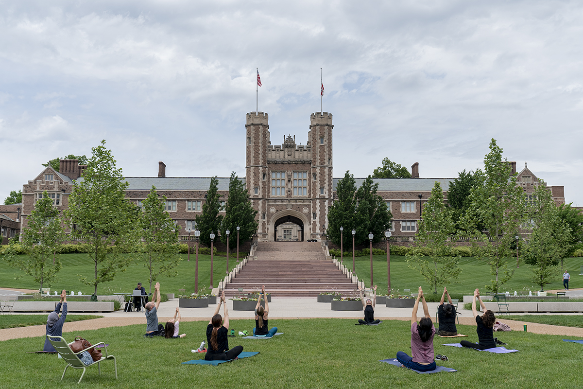 The university’s Wellness Team partnered with Sumers Recreation Center to offer an outdoor yoga class to staff members June 1 in Tisch Park. (Photo: Whitney Curtis/Washington University)