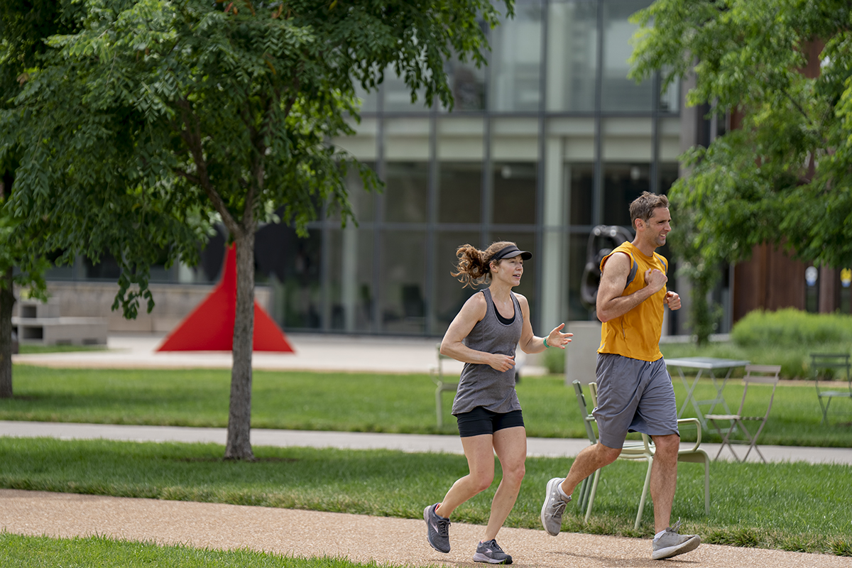 Two runners jog across the East End on June 1. (Photo: Whitney Curtis/Washington University)
