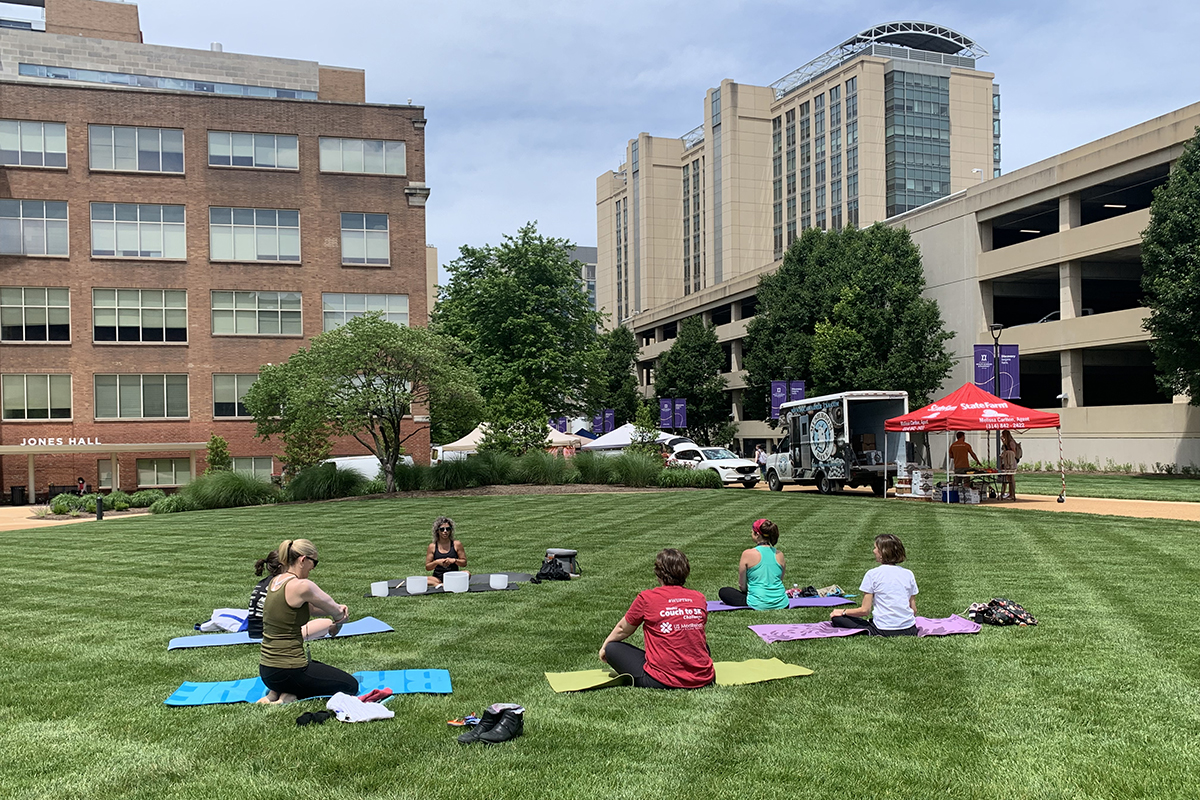 The university’s Wellness Team partnered with Sumers Recreation Center to offer an outdoor yoga class to staff members on June 2 at the Farmer’s Market on the Medical Campus. (Courtesy photo)