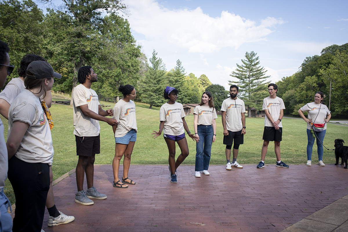 Current students and alumni play an icebreaker game to get to know more about one another at the Gephardt Institute Civic Scholars 10 Year Celebration Fall Kick-off Retreat on Sept. 10 at Camp Wyman in Eureka, MO. (Photo: Carol Green/Washington University)