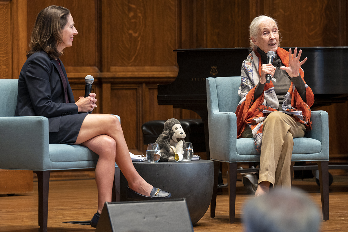 Jane Goodall, founder of the Jane Goodall Institute and UN Messenger of Peace, shares fascinating insights on her evolution from curious young girl to intrepid scientist to global icon with Crickette Sanz, professor of biological anthropology, on Oct. 9 in Graham Chapel. (Photo: Sid Hastings/Washington University)