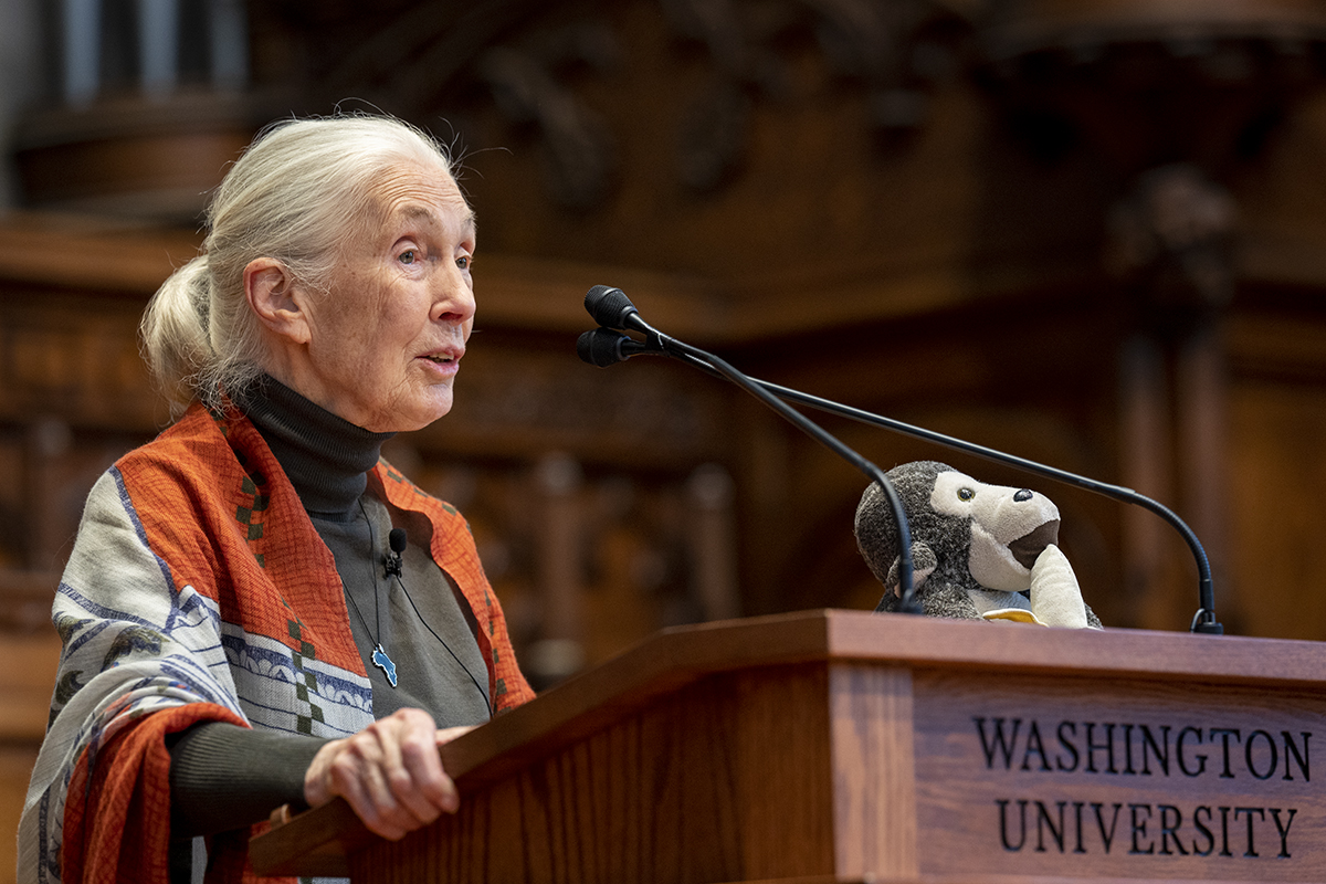 Noted primatologist Jane Goodall visits campus to deliver an Assembly Series lecture titled “Inspiring Hope Through Action” Oct. 9 at Graham Chapel. (Photo: Sid Hastings/Washington University)