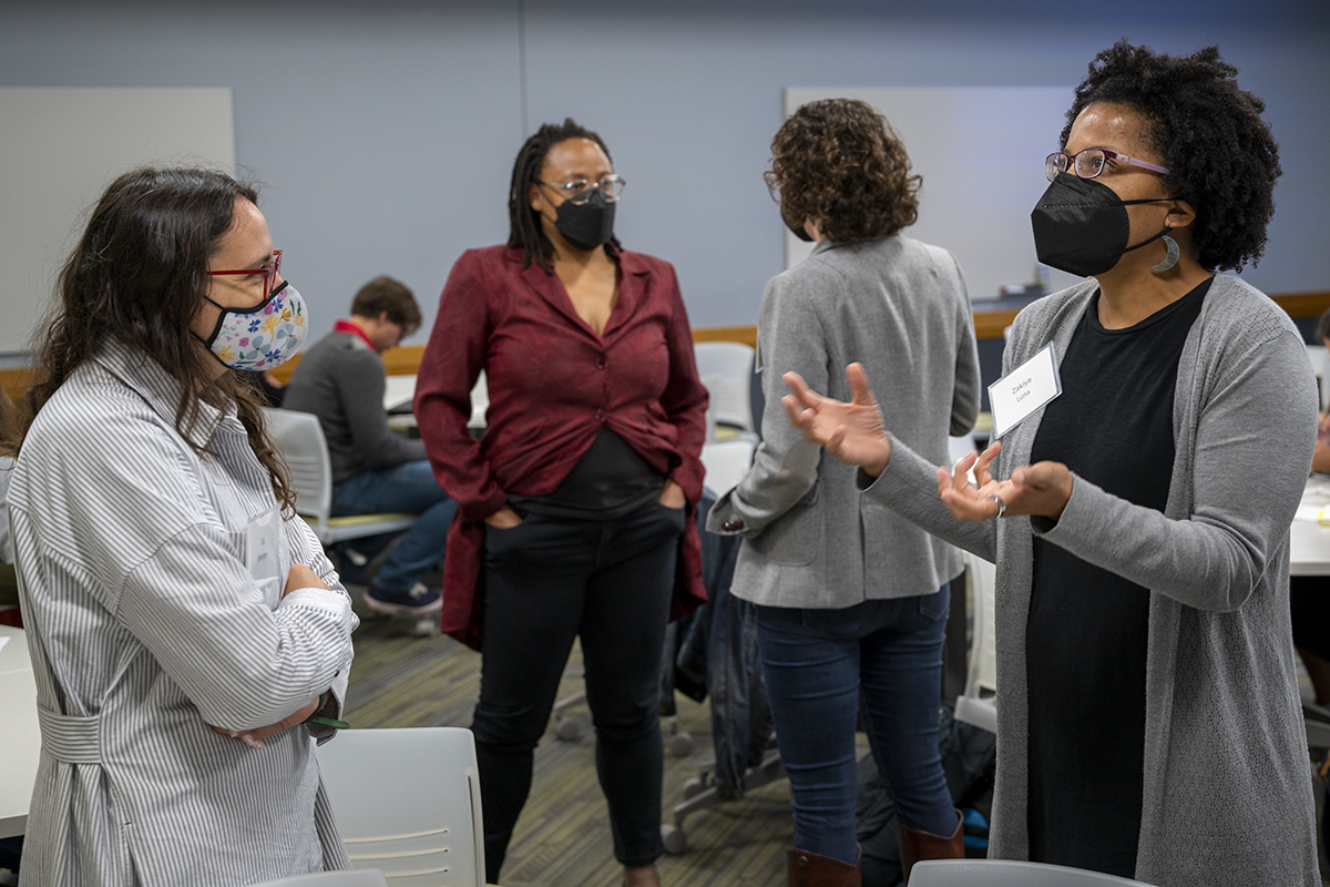 Ila Sheren (left), associate professor of art history and archaeology, and Zakiya Luna, associate professor of sociology, have a conversation at the “Mid-Career Faculty Program” Sept. 30 in Simon Hall. (Photo: Sid Hastings/Washington University)