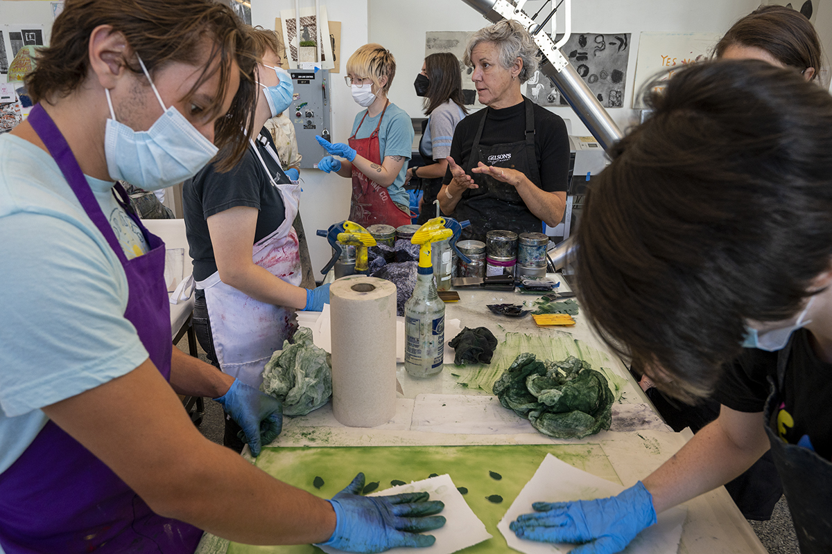 Professor Lisa Bulawsky, along with student volunteers and faculty associated with Island Press, welcomed Shaun O’Dell, an artist who explores the realities of the human and natural orders, on Sept. 28 in Bixby Hall. (Photo: Sid Hastings/Washington University)