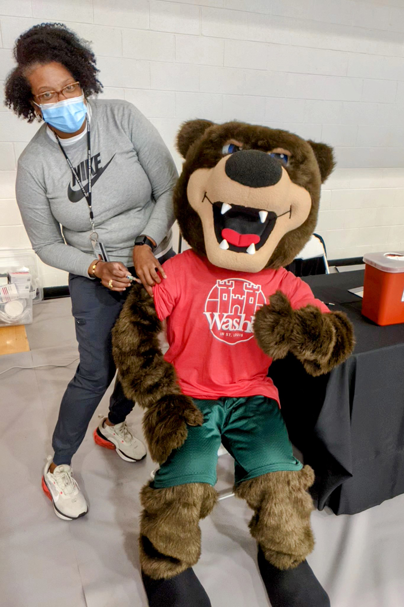WashU’s HR Well-Being Team hosted a Take Care Health Fair for employees at the Sumers Rec Center on Oct. 11. The WashU Bear was on site and got his flu shot at the event. (Courtesy photo)