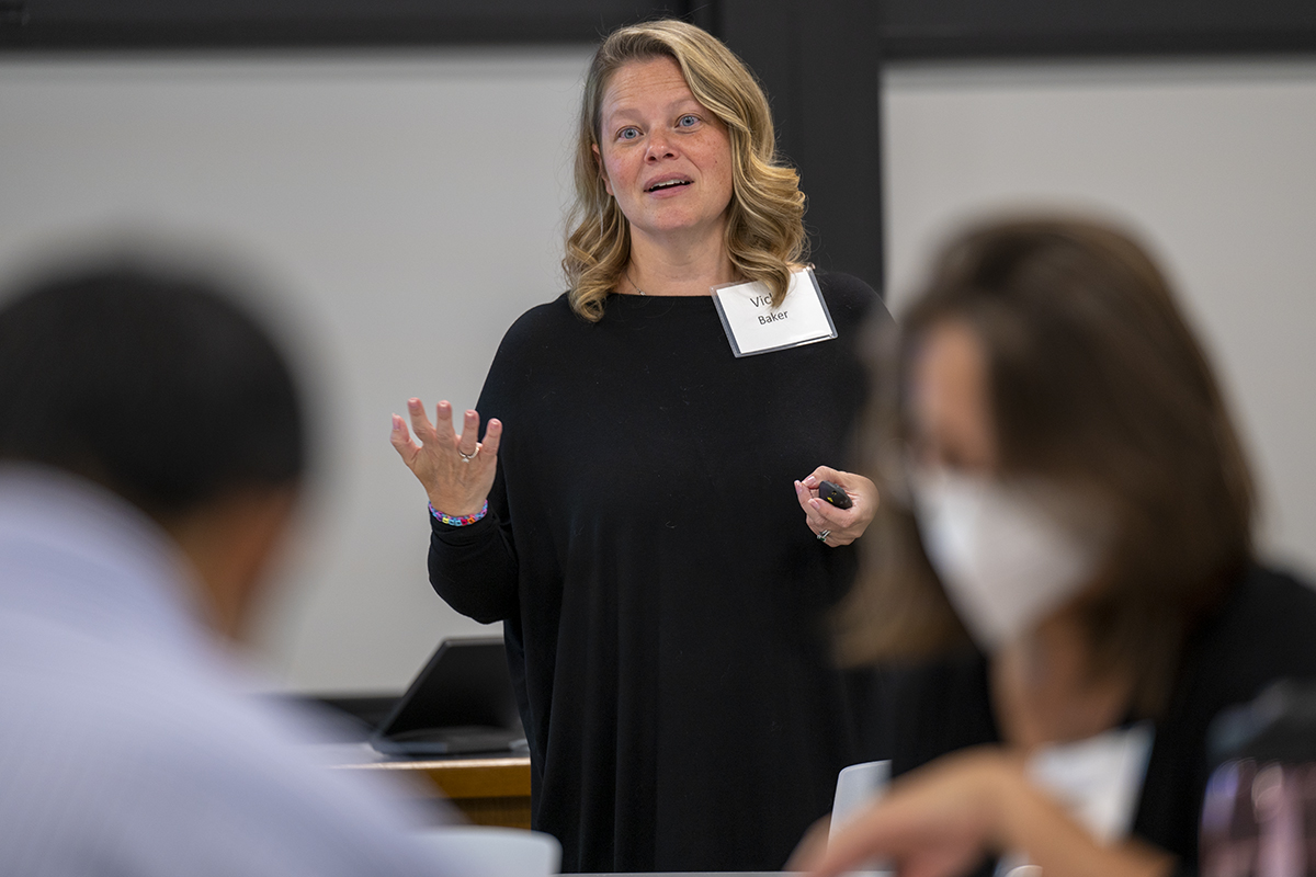 Vicki Baker, professor of economics and management at Albion College, led a “Mid-Career Faculty Program” in Simon Hall Sept. 30, hosted by the Office of the Provost. (Photo: Sid Hastings/Washington University)