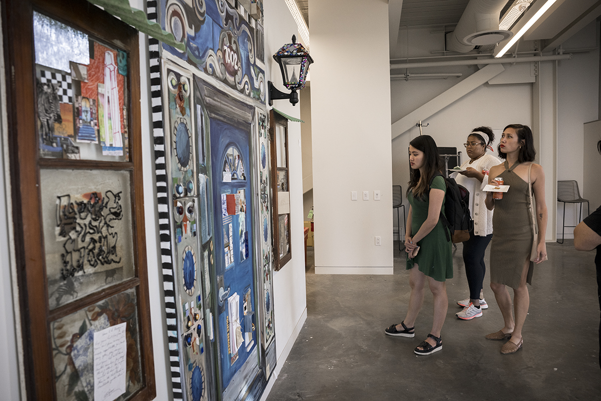 A group of exhibit attendees observe “Wysteria Lane” by Sarah Moon on view in the “Show Me Yours” Sam Fox First Year MFA-VA Exhibition Sept. 21 in Weil Hall. (Photo: Carol Green/Washington University)