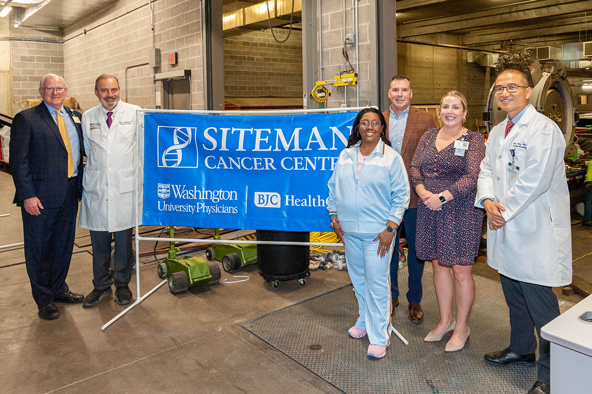 John Lynch, president of Barnes-Jewish Hospital (left); Dennis Hallahan, chair of the Department of Radiation Oncology; Adrienne Tillman, a Proton Therapy Center patient; Lee Kling, philanthropist; Kaci Dannatt, executive director of business operations for Siteman Cancer Center and Tianyu Zhao, chief of Proton Medical Physics Services, celebrate the arrival of the Siteman Proton Hyperbeam. (Photo: Jay Shelp/BJC Media Services)