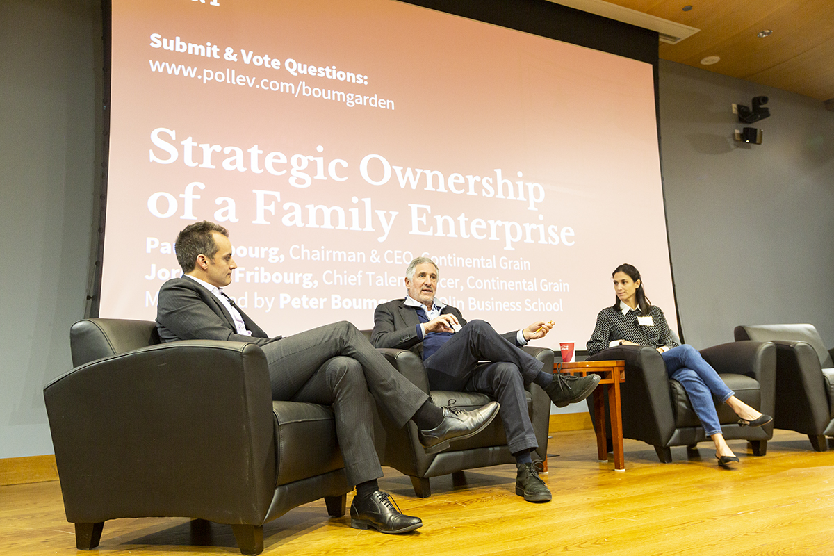 Jordana Fribourg (right), chief talent officer for Continental Grain, and Paul Fribourg, chairman and CEO of Continental Grain, participate in the panel “Strategic Ownership of a Family Enterprise” as part of the Seventh Annual Olin Family Business Symposium moderated by Olin professor Peter Boumgarden (left), Oct. 19 in Knight Hall’s Emerson Auditorium. (Photo: Jerry Naunheim Jr./Washington University)