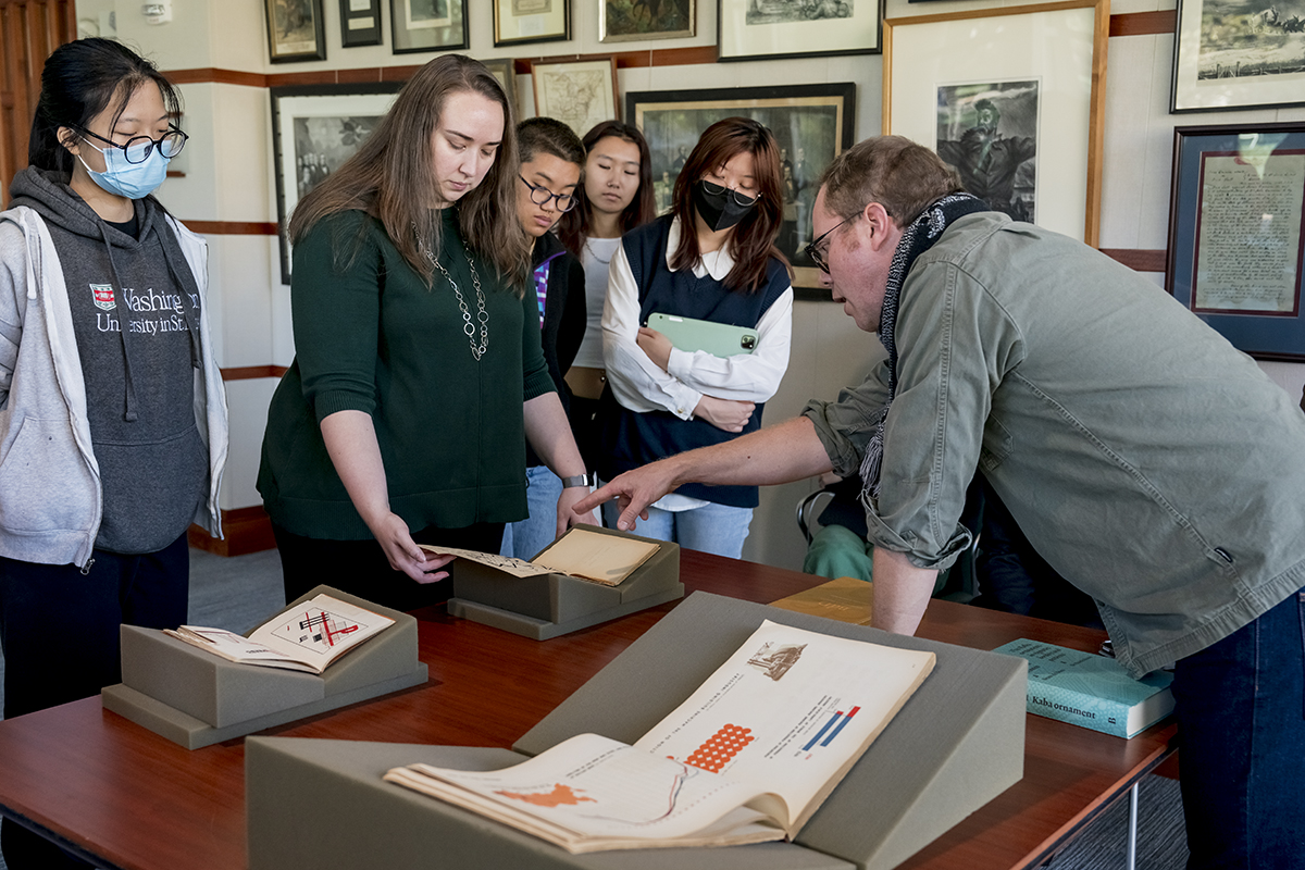 Sam Fox School of Design & Visual Arts students visit Olin Library Oct. 19 to learn about the library’s resources and typographic collections. Ben Kiel (right), a typeface designer and senior lecturer, works with students. (Photo: Whitney Curtis/Washington University)
