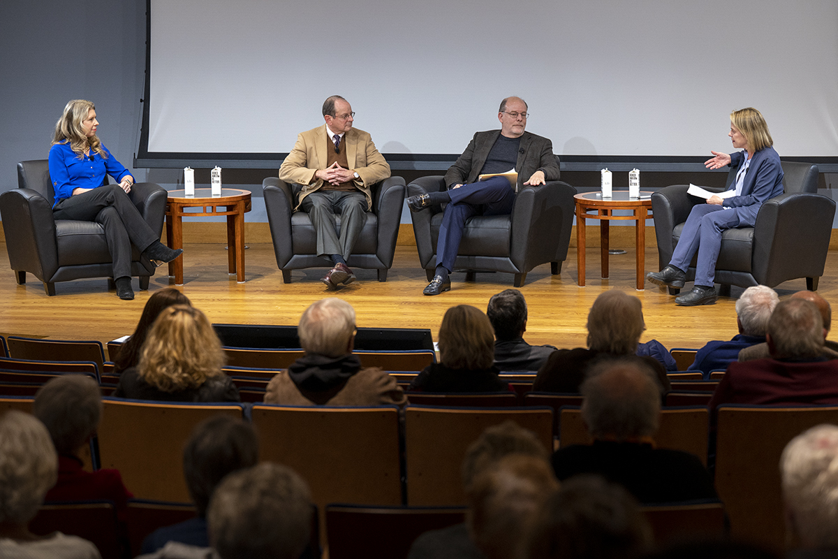 Public scholars and authors Cherie Harder (left), Jonathan Rauch and Peter Wehner participate in a public conversation titled “The assault on truth and what to do about it.” The event was hosted by the John C. Danforth Center on Religion and Politics and moderated by center director R. Marie Griffith (right) Oct. 19 in Emerson Auditorium. (Photo: Sid Hastings/Washington University)