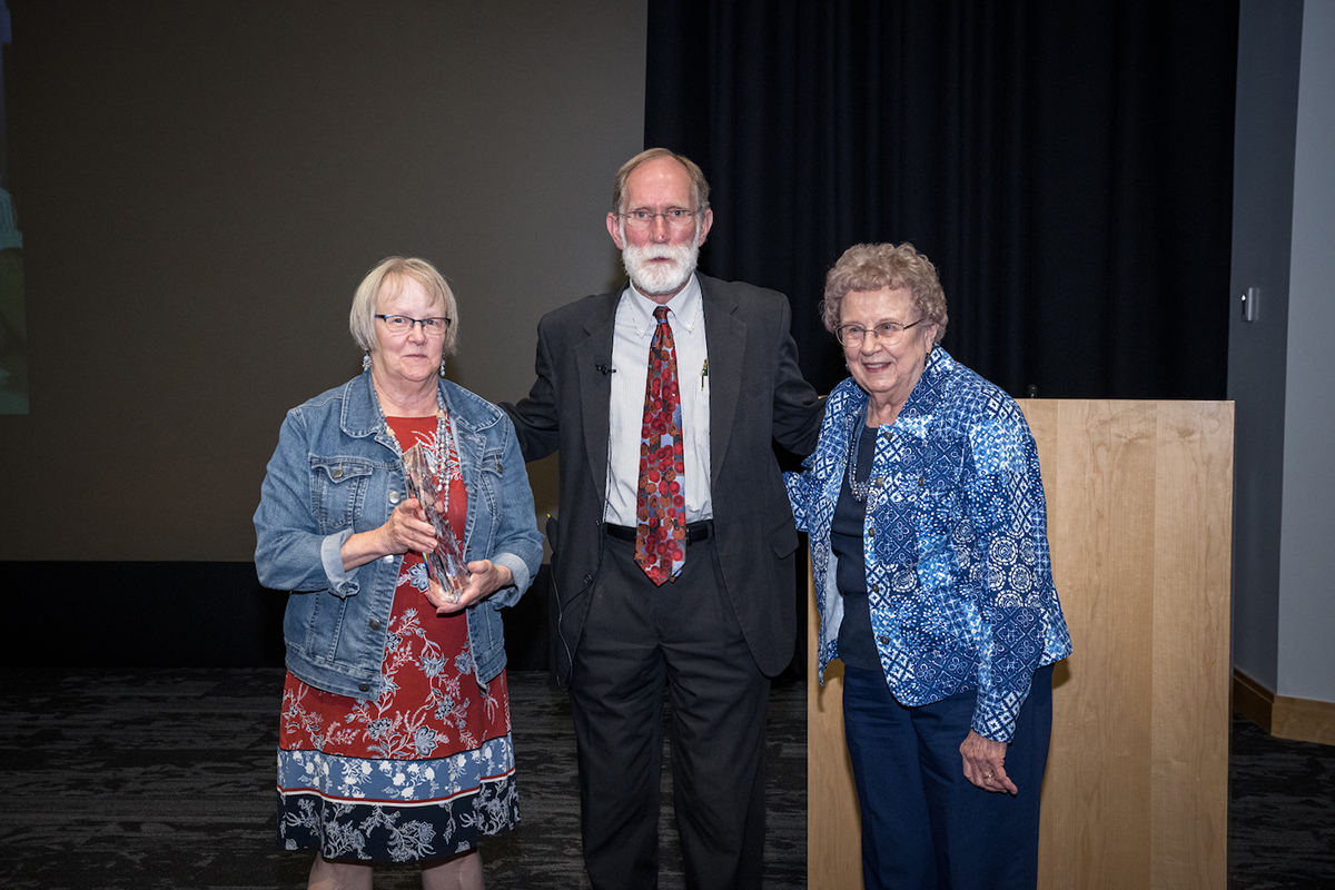 Peter Agre, MD, winner of the Nobel Prize in Chemistry in 2003, gave the Stanley J. Korsmeyer Memorial Lecture Oct. 6 at the Eric P. Newman Education Center on the Medical Campus. Shown (from left) are: Lynn Hollahan, Korsmeyer’s sister; Agre; and Carnell Korsmeyer, Korsmeyer’s mother. Korsmeyer, MD, was an internationally known cancer researcher and beloved former Washington University medical oncologist whose groundbreaking discoveries opened new doors to understanding and treating cancer. The memorial lectureship was established in 2005, after Korsmeyer died of cancer. (Photo: Carol Green/Washington University)