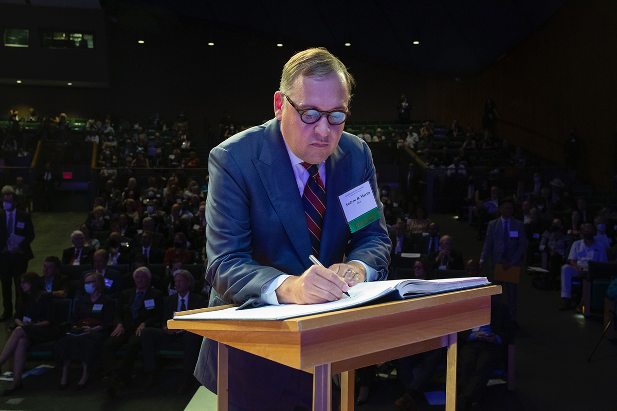 Earlier this fall, the American Academy of Arts and Sciences inducted Chancellor Andrew D. Martin and faculty members Deanna Barch, John Baugh, Pascal Boyer and Holden Thorp as members. An honorary society and policy organization founded in 1780, the academy elects exceptionally accomplished individuals and engages them in advancing the public good. Martin signed the Book of Members at an induction ceremony that celebrated recently elected artists, scholars, scientists and leaders in the public, nonprofit and private sectors. (Courtesy photo)