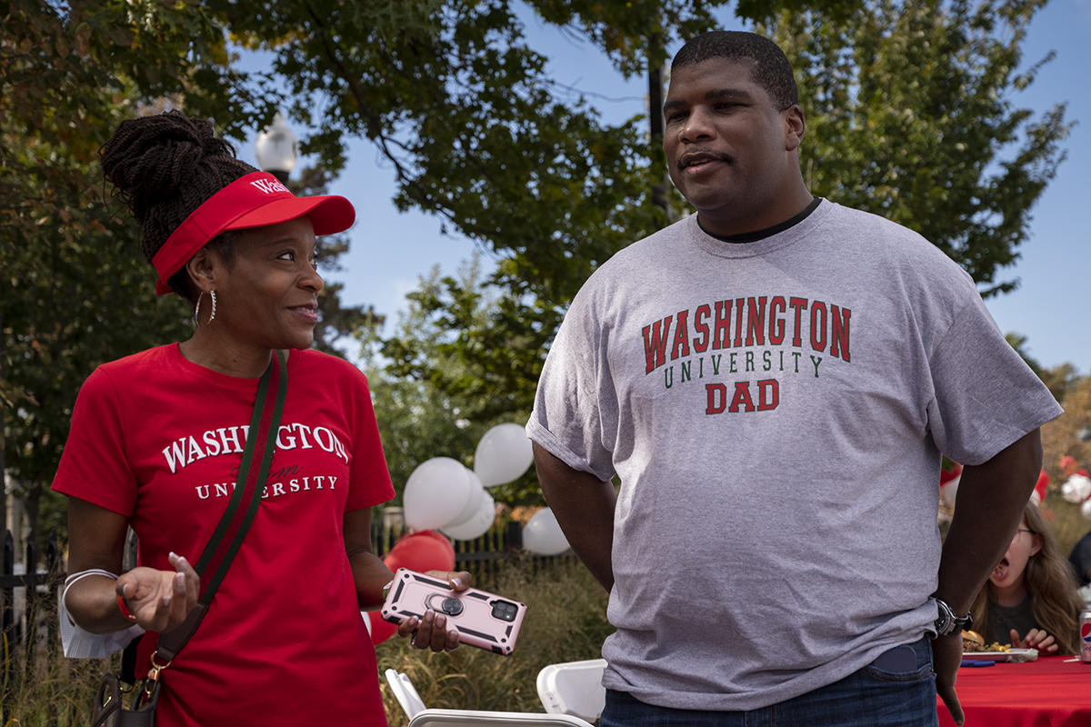 LaDonna Baldwin and Brad Baldwin participate in Parent & Family Weekend Oct. 22 in the Simon Hall parking lot. The weekend included walking tours of St. Louis neighborhoods, open houses, panels, and a tailgate preceding the WashU football game against North Central College. (Photo: Sid Hastings/Washington University)