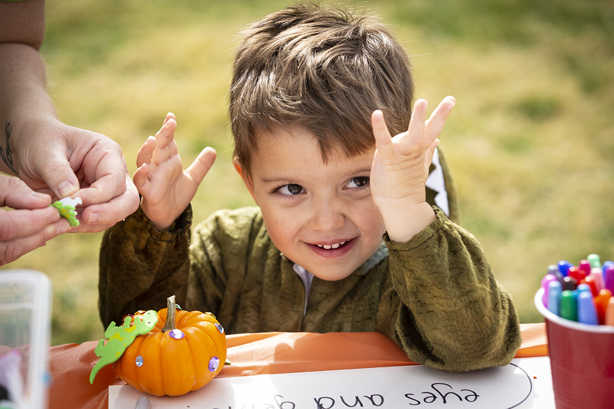Sage McDaniel, 3, decorated a pumpkin during “Safe trick-or-treat” hosted by the WashU Campus Y Oct. 23 on Mudd Field. (Photo: Jerry Naunheim Jr./Washington University)