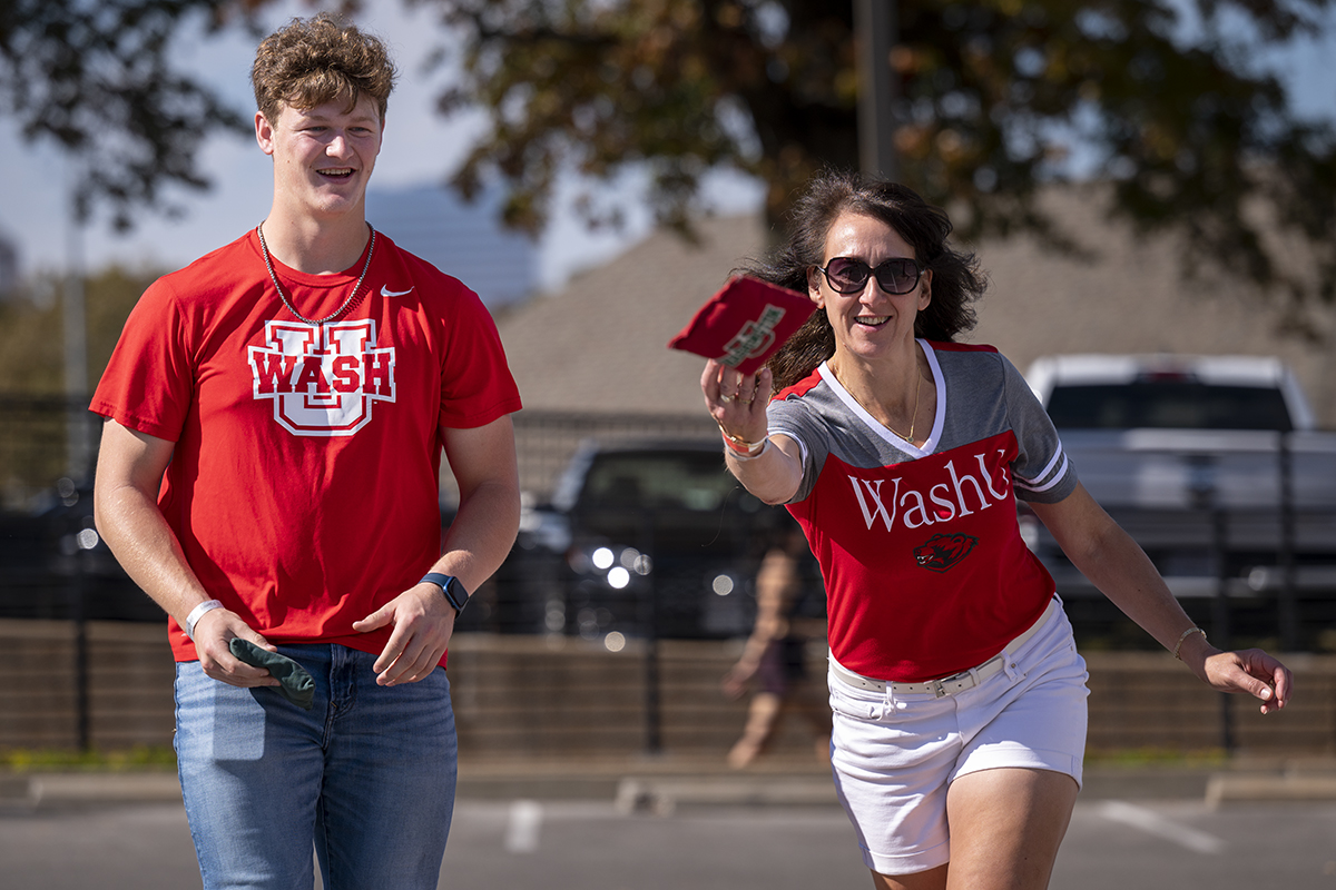 WashU student Connor Lindsey plays a game of bags with his mom, Connie Lindsey, at Parent & Family Weekend Oct. 22 in the Simon Hall parking lot. (Photo: Sid Hastings/Washington University)