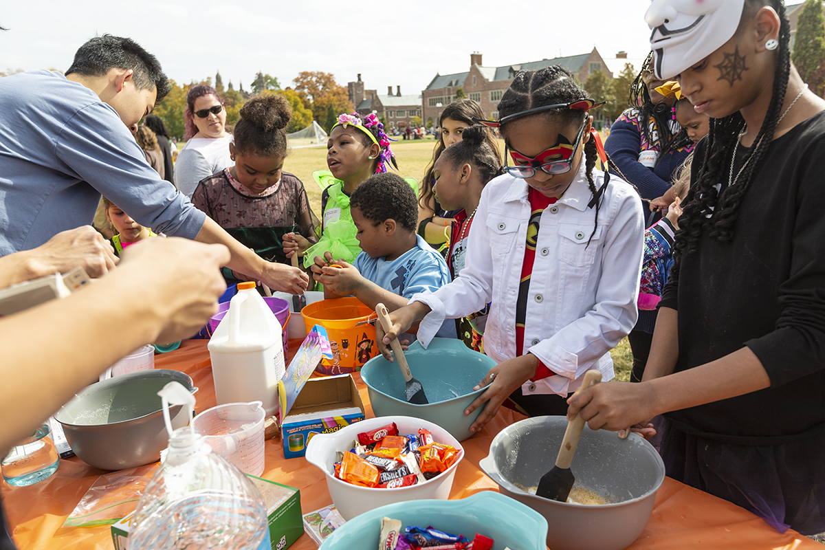 The WashU Campus Y welcomed St. Louis families to campus to enjoy “Safe trick-or-treat” featuring Halloween-themed games, crafts, and trick-or-treating with student volunteers Oct. 23 on Mudd Field. (Photo: Jerry Naunheim Jr./Washington University)