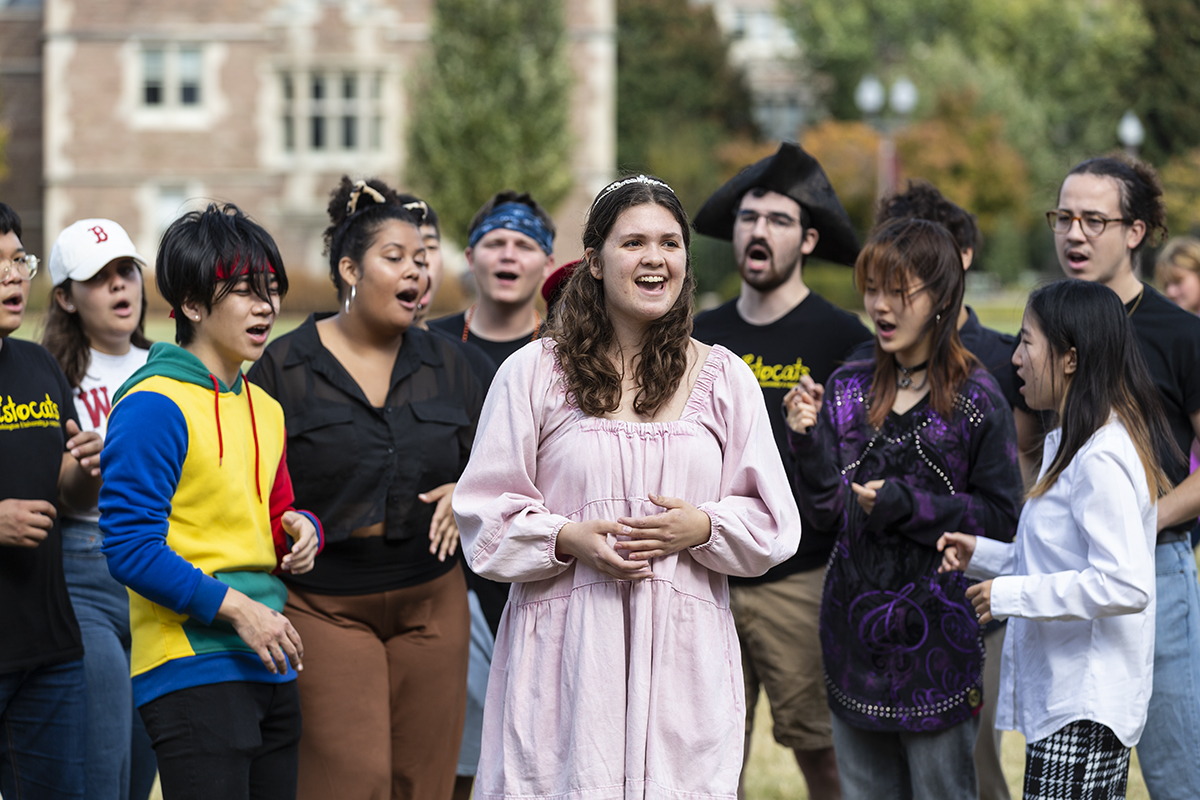 The Aristocats, a Disney-themed student a cappella group, participate in “Safe trick-or-treat” hosted by the WashU Campus Y Oct. 23 on Mudd Field. (Photo: Jerry Naunheim Jr./Washington University)