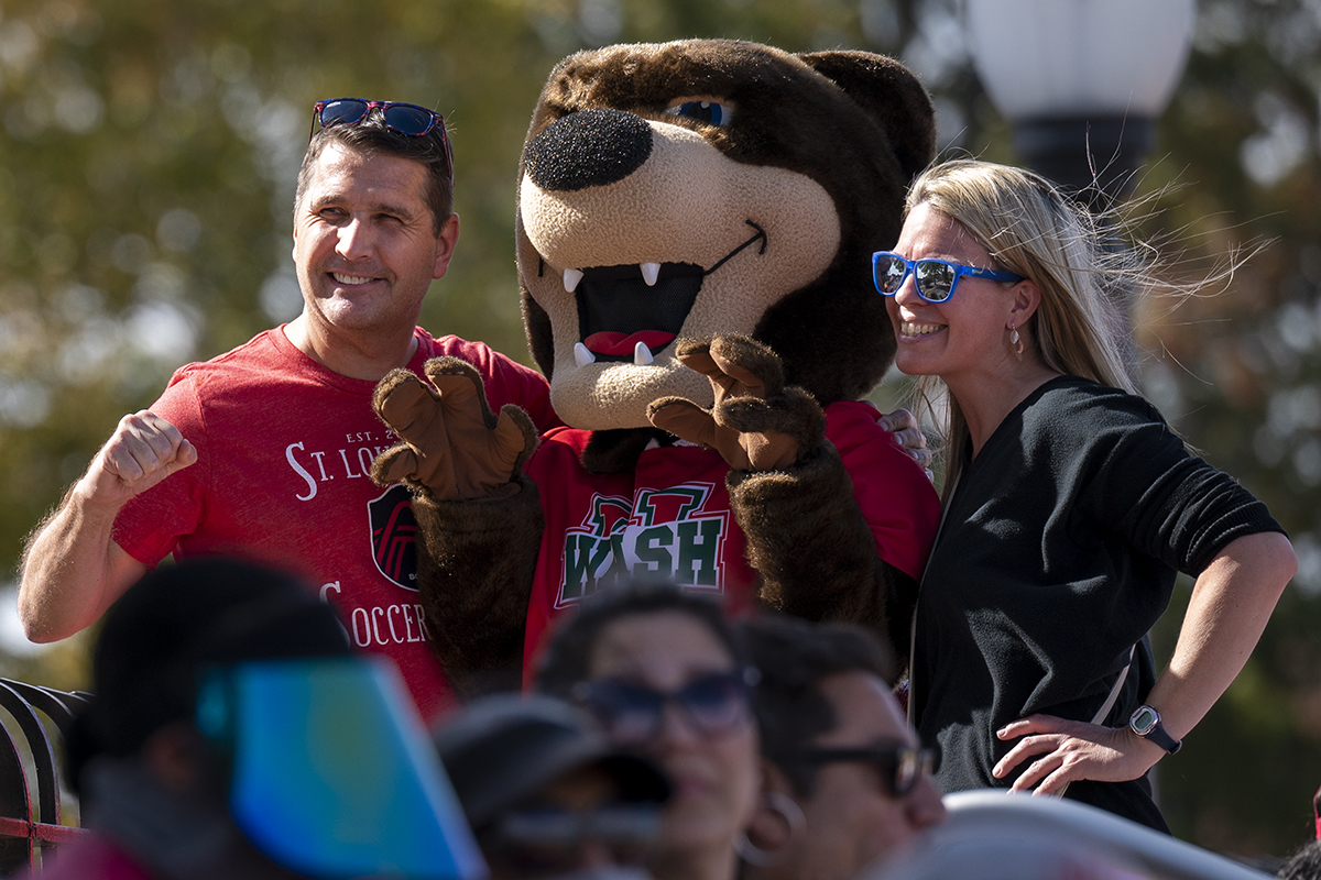 Students, alumni and their families gathered for Parent & Family Weekend Oct. 22-23. A tailgate preceded the WashU football game against North Central College on Francis Olympic Field. The WashU bear was also in attendance, posing with participants. (Photo: Sid Hastings/Washington University)