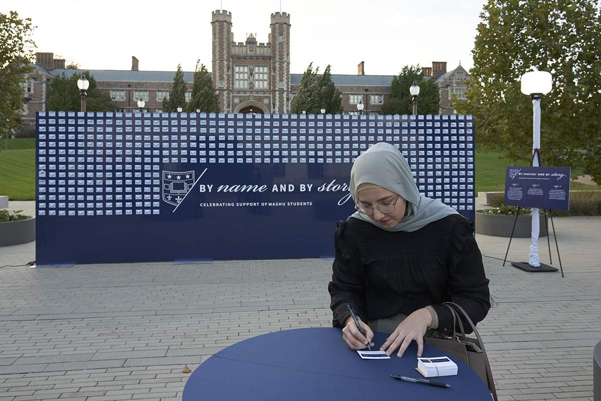 Lejla Jakupovic, a law student, contributes a message during the “By Name and By Story” event for scholarship donors and recipients. Participants were encouraged to write a meaningful message of inspiration, gratitude or encouragement for students and donors.
