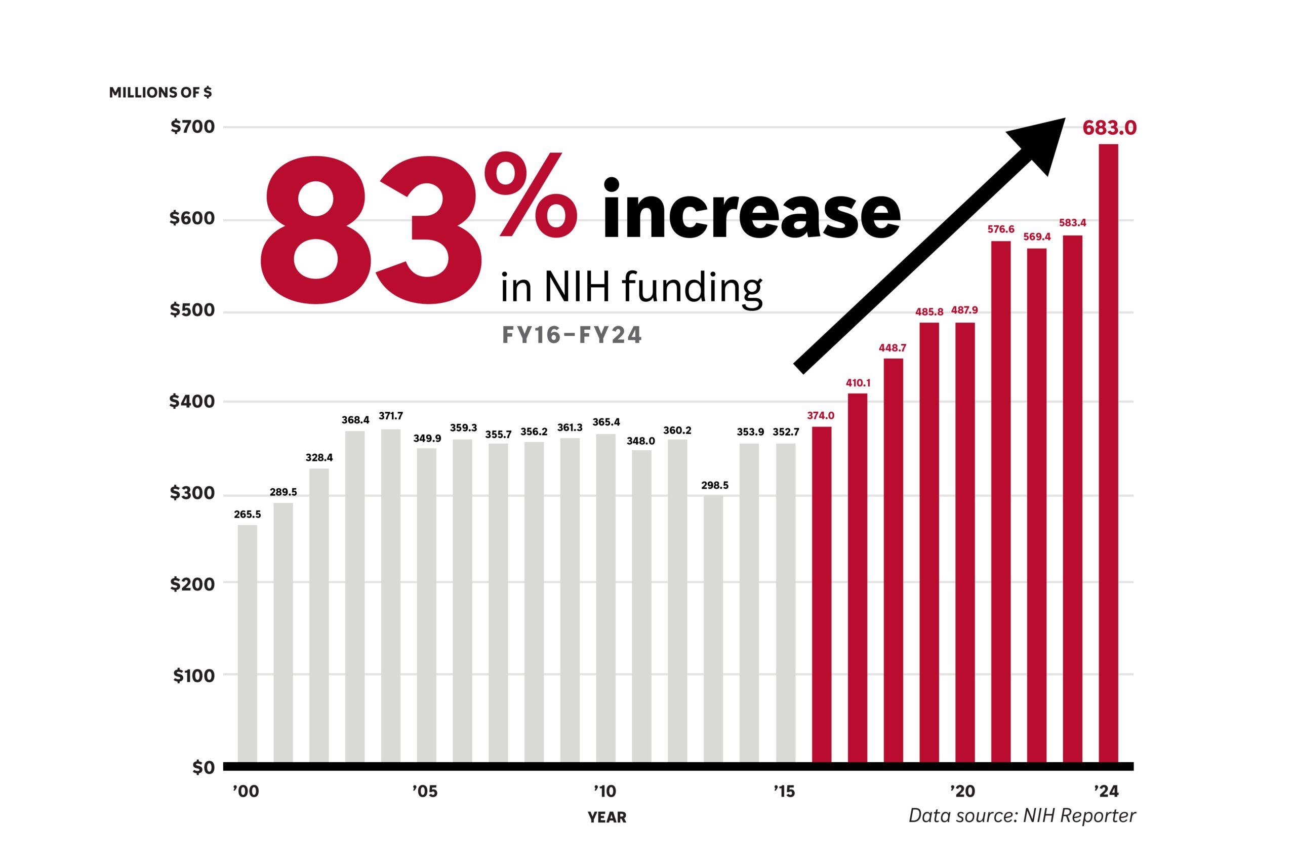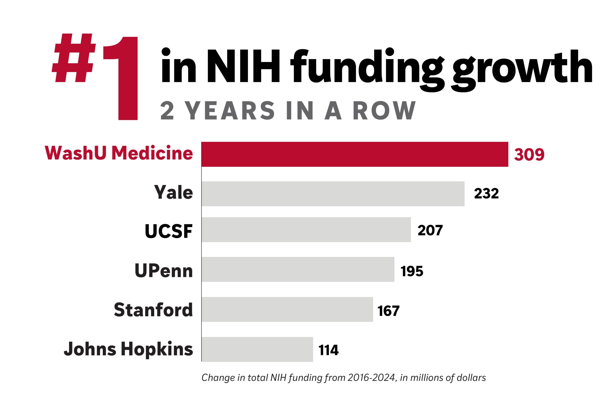 This support — which places the school at No. 2 in NIH funding nationwide for the second year in a row — enables groundbreaking advances in the understanding, diagnosis and treatment of illnesses and propels its relentless pursuit of improvements in medical care. Over the past eight years, WashU Medicine has been the fastest growing of the top U.S. research-intensive medical institutions in NIH funding.