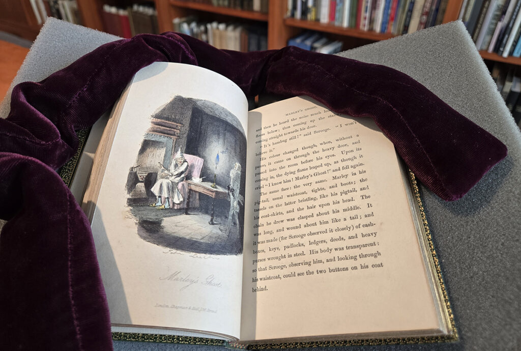 At our showcase, guests will have an opportunity to see our amazing collection of Dickens, including multiple first editions. What is especially exciting to me is that we have copies of “fascicles” in their original wrappers. A lot of Dickens’ works were serialized — he would publish a couple of chapters at a time while he wrote the next set. These pamphlets are hard to find because they were read to death until they fell apart. So to have some in their original, serialized format is just very exciting. We also have a complete set of first editions of his Christmas stories — there’s five, of which “A Christmas Carol” is the most famous. We also will showcase two letters handwritten by Charles Dickens and various illustrated editions of “A Christmas Carol” so people can see how illustrators have told the story over time.