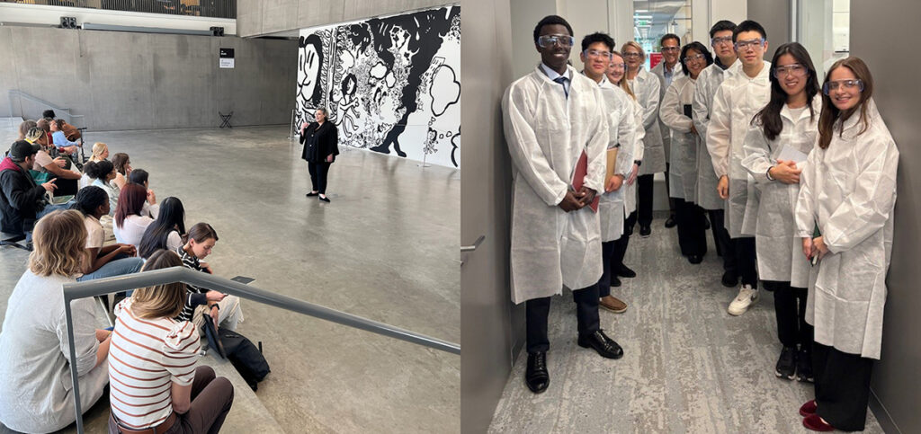 (At left) Lisa Melandri, executive director of the Contemporary Art Museum St. Louis, shared career advice with students at the Arts & Cultural Institutions Bear Trek last semester. (At right) Students in the health-care and sciences career community visited a range of businesses, startups and labs in Boston at this fall’s Pharmaceuticals and Bio Bear Trek. (Courtesy photos)