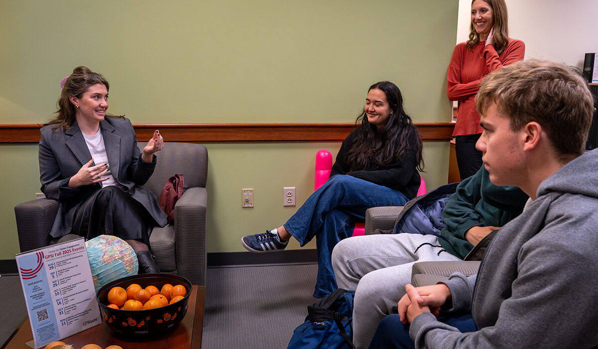 Reeves Oyster, ‘19 (left), visited campus to discuss her experiences working with political campaigns with students Hannah La Porte (second from left), Daniel Niu and Ben Lumi (right). Susan Craig (standing), associate director of the government, policy and social impact career community, said the community boasts 1,400 alumni who are a willing resource for students and one another. (Photo: Sid Hastings/WashU)