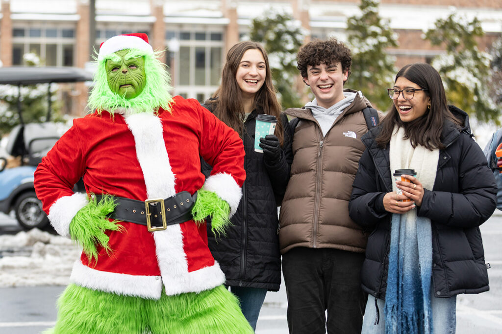 The Grinch greets students Dec. 2 at Dr. G’s Funhouse, an opportunity to enjoy food, games and ice skating. (Photo: Jenny Sinamon/Student Affairs)