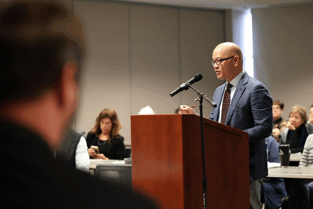 Three WashU leaders in artificial intelligence (AI) participated in a Missouri House Future Caucus hearing that brought together public- and private-sector experts to discuss the opportunities and challenges of deploying AI across the state. Dan Maranan (pictured), executive director of the Digital Intelligence & Innovation (DI2) Accelerator, took part, along with Eric Fournier, at the Center for Teaching & Learning, and Adam Wilcox, at the Institute for Informatics, Data Science & Biostatistics. (Photo: Carter Staley)