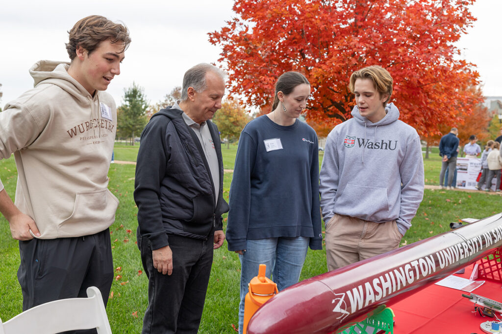 Members of the WU Rocketry team show off their rocket to Aaron Bobick (second from left), dean of the McKelvey School of Engineering, during the McKelvey in Action event Nov. 8. (Photo: JJ Lane/WashU)