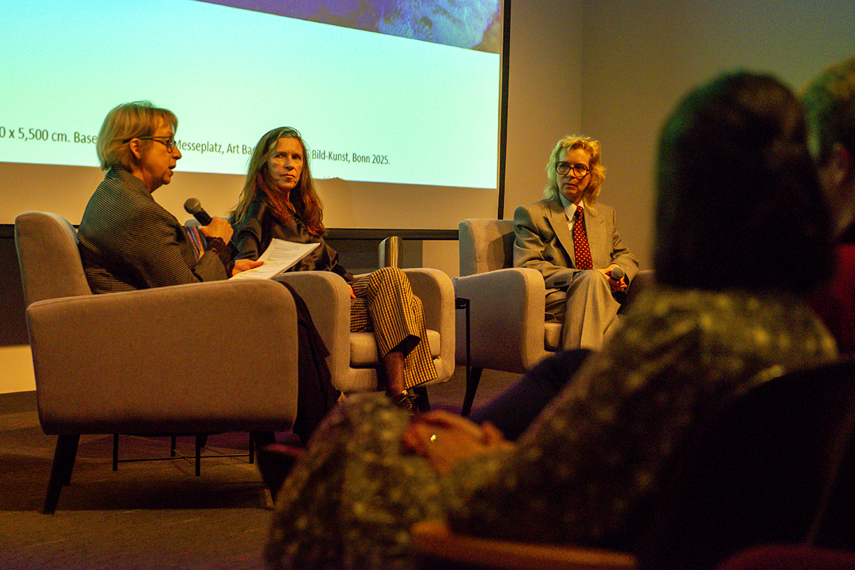 Sabine Eckmann (left), director and chief curator of the Kemper Art Museum, moderates a conversation between artists Mary Weatherford (center) and Katharina Grosse Nov. 19 in the Kemper Art Museum. The talk was part of the Sam Fox School’s fall Public Lecture Series, in conjunction with the “Making Their Mark: Works from the Shah Garg Collection” exhibition, which includes both artists. (Photo: Kate Munsch/WashU)