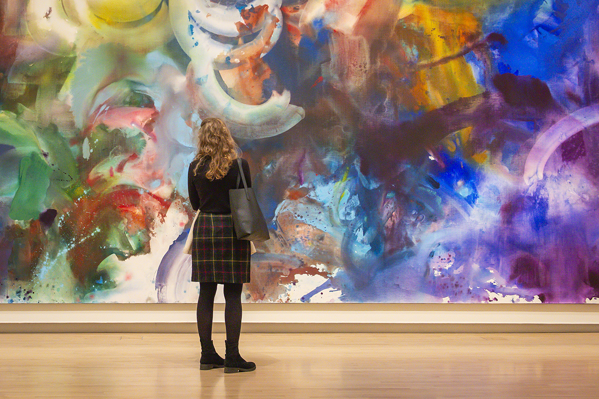 A visitor at the Kemper Art Museum views artist Mary Weatherford’s largest painting “Light Falling Like a Broken Chain; Paradise” Nov. 19. The medium is Flashe on linen. (Photo: Kate Munsch/WashU)