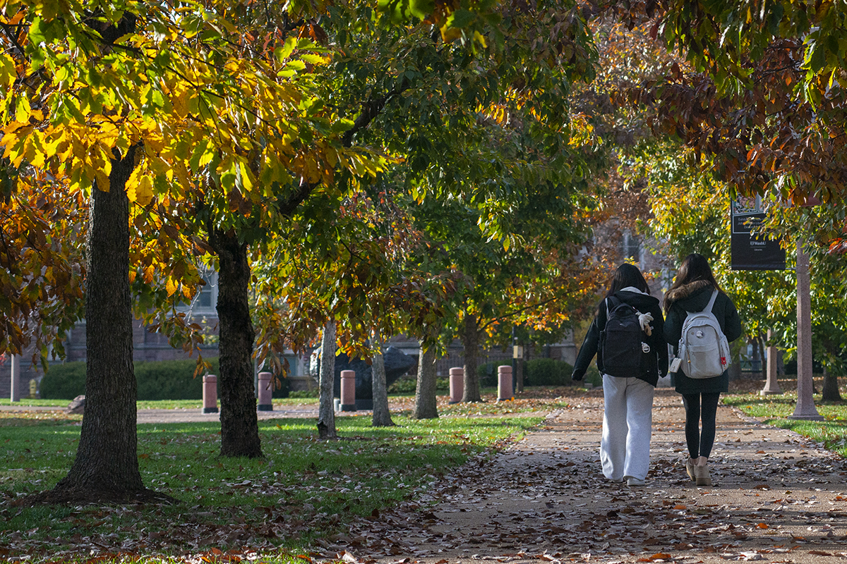 Students take a stroll along the Ginkgo Allée on the Danforth Campus Nov. 22. (Photo: Kate Munsch/WashU)