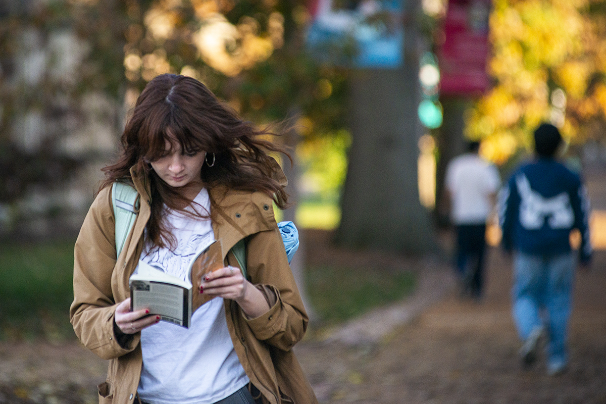 A student reads a book while walking through the Danforth Campus Nov. 22. (Photo: Kate Munsch/WashU)