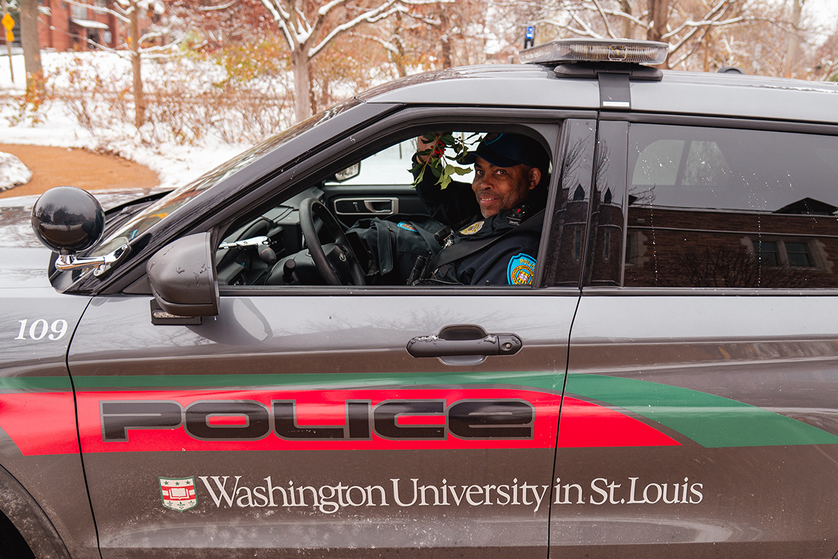 A WUPD officer navigates the Danforth Campus on a snowy day Dec. 2. (Photo: Ali Overstreet/WashU)
