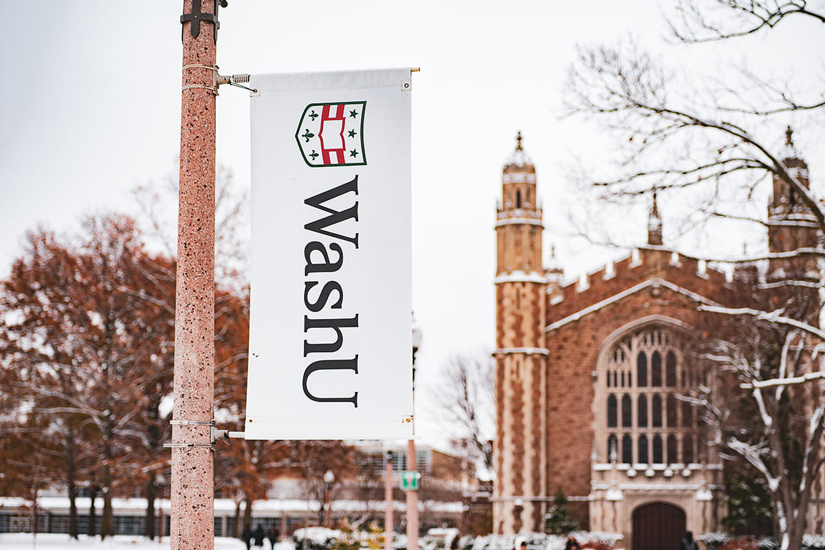 A WashU banner stands out against the backdrop of a snowy Danforth Campus Dec. 2. (Photo: Ali Overstreet/WashU)