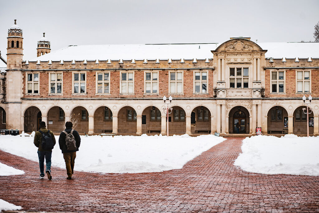 Students cross in front of Ridgley Hall Dec. 2 after a snowfall. (Photo: Ali Overstreet/WashU)